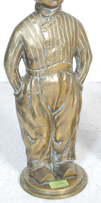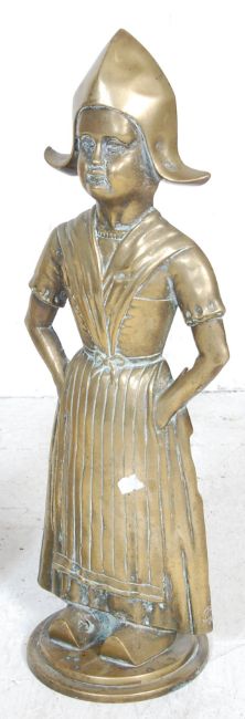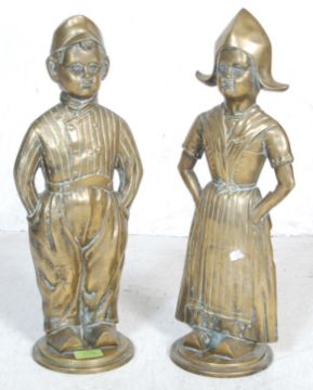 A large pair of 20th century antique style brass Dutch door stops / fireside ornament. The large brass figurines depicting a boy and a girl raised on two steps circular plinth base. Measures: 49cm tall.