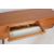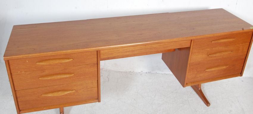 A retro vintage teak wood dressing table / writing desk in the manner of G Plan having a central hidden drawer over a kneehole flanked by two banks of drawers with lipped handles raised on tapering legs by side stretchers. 69cm h x 169cm w x 43cm d