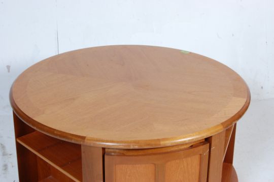A rare vintage retro 20th century teak wood Nathan revolving coffee table. The coffee table of a circular form with panels doors and open shelves. 53cm h x 91cm diameter.