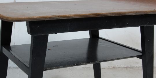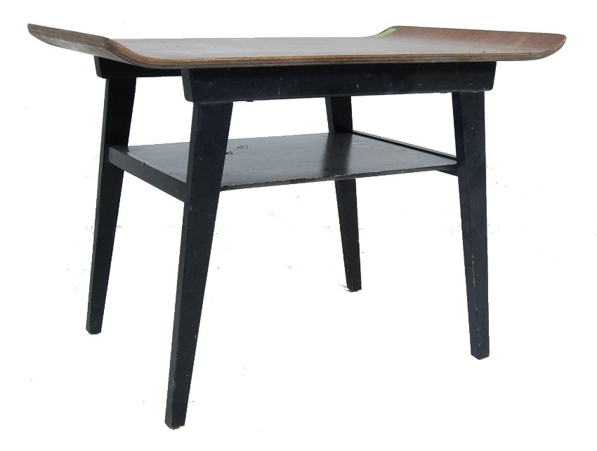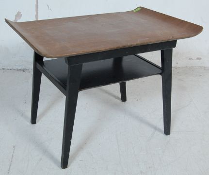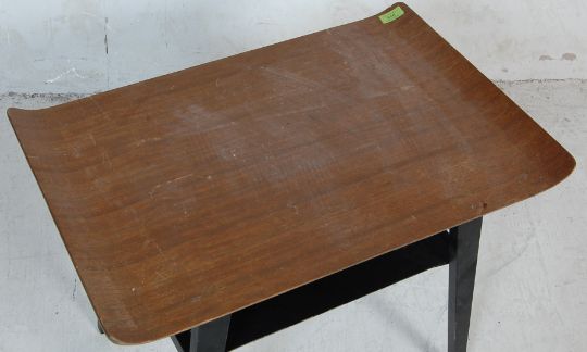 A vintage retro 20th century teak wood veneer surf board coffee table. The coffee table of a rectangular form with raised ends raised on black tapered legs united by a undertray. 49cm h x 66cm w x 46cm d