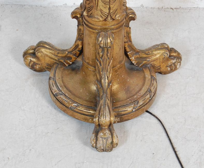 A vintage 20th century Hollywood Regency style standard lamp having a geometric patterned column with floral finials raised on a tripod claw base. Measures 154cm tall.