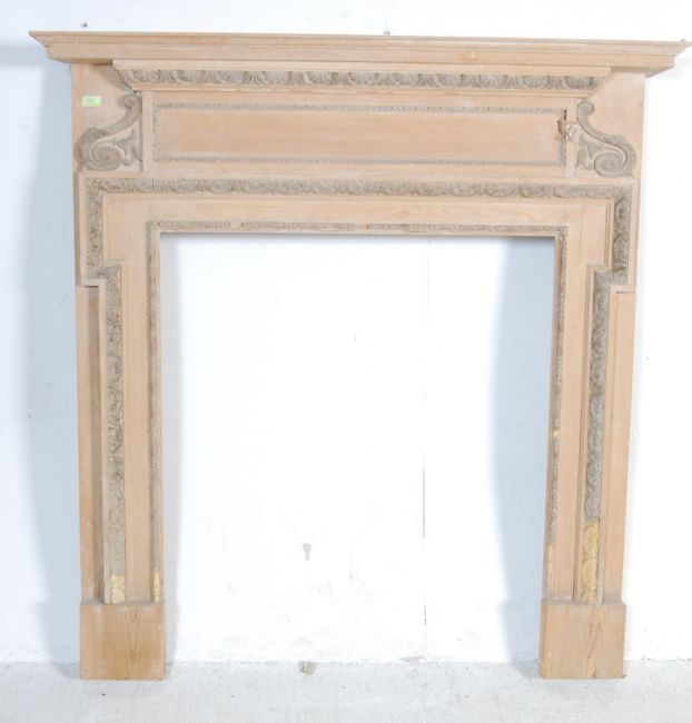 A 20th century antique style pine surround in the manner of Adams. The large fire surround having a pediment top with scrolled and foliate carved detailing around the border. Measures 140 x 134cm.