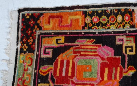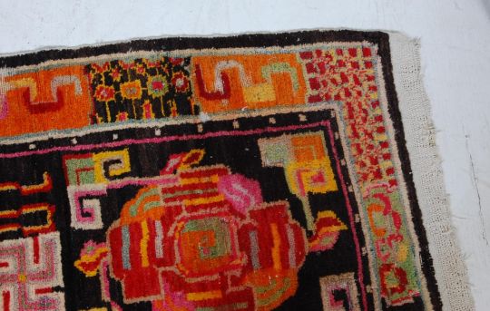 A decorative vintage 20th century handwoven Tibetan rug having vibrantly coloured yin and yang motifs set within a border decorated with geometric patterns & tassels to each end.  Measures 170cm x 82CM