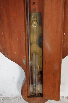 A 19th Century Georgian banjo barometer having a carved mahogany frame with a thermometer to the top, a painted scene to the middle and the barometer dial below.