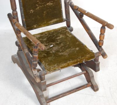 A 19th Century Victorian mahogany aesthetic movement Boston Rocker - American Rocking chair / armchair. Raised on sleigh base with sprung rock action, upholstered seat with spindle gallery arms and backrest.