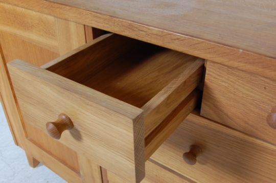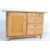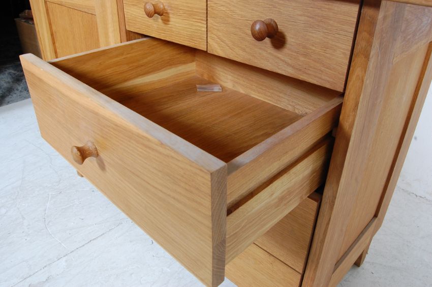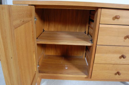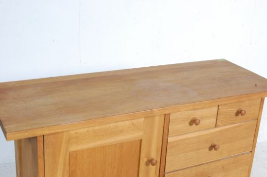 A contemporary Oak Furniture Land sideboard having a flared top over a single door cupboard with a bank of five cupboards to the right raised on stile feet. 77cm h x 119cm w x 44cm d