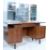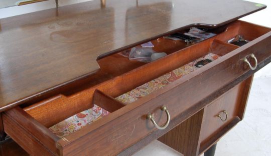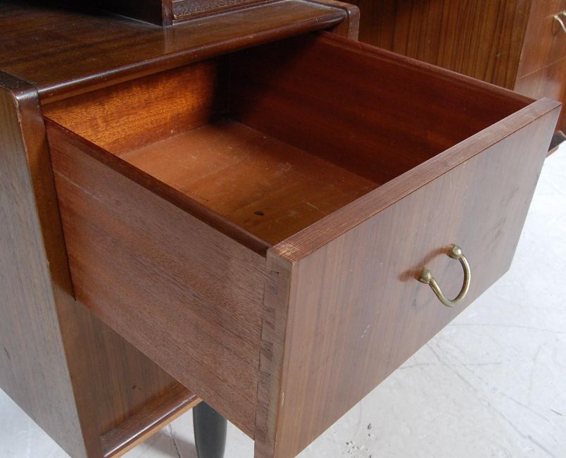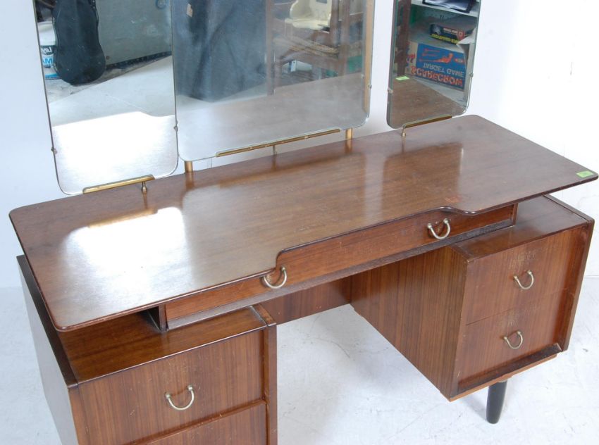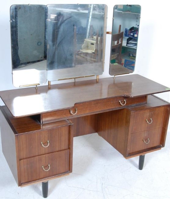 A retro mid 20th Century 1960's G PLAN Librenza teak wood bedroom dressing table, having shaped top with drawer to the frieze and a bank of two drawers to the each side raised on ebonised legs. 129cm h x 124cm w x 47cm d