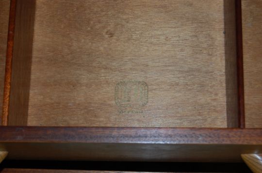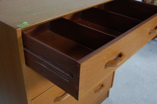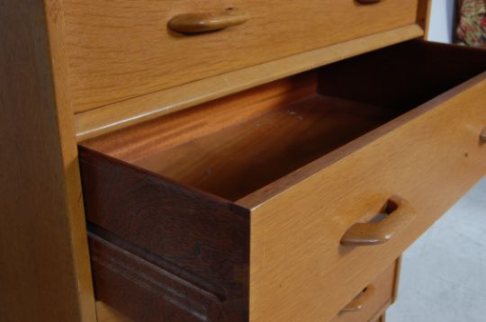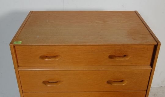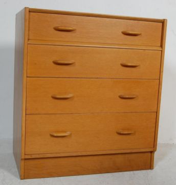 A retro vintage mid 20th century 1950s golden oak Brandon range G plan chest of drawers having a bank of four drawers with wooden pulls raised on an upright base. E Gomme gilt stamp to the drawer.