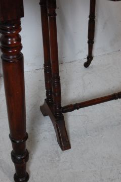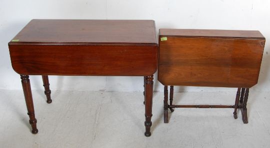 A 19th century Victorian mahogany pembroke table / dining table. The table of a rectangular with twin drop leaf to each side, single drawer to the frieze raised on turned legs with casters along with a Edwardian mahogany sutherland table having shaped top raised on turned gate legs. Measures 71 x 88 x 45cm.