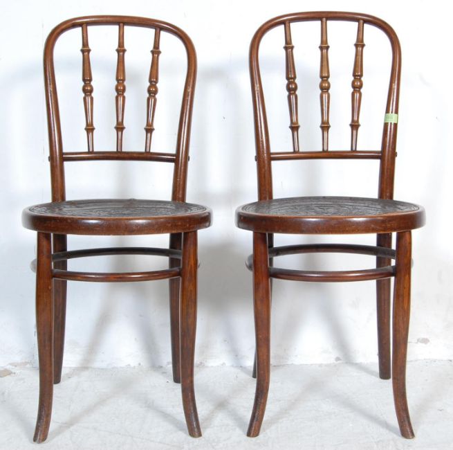 Michael Thonet - A pair of vintage retro early 20th century circa 1920’s Thonet bentwood cafe / bistro dining chairs. The chairs with circular panel seat raised on turned supports having upper peripheral stretchers with spindle gallery back rests. Makers label to the underside. Measures 94 x 42 x 42cm.