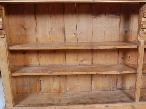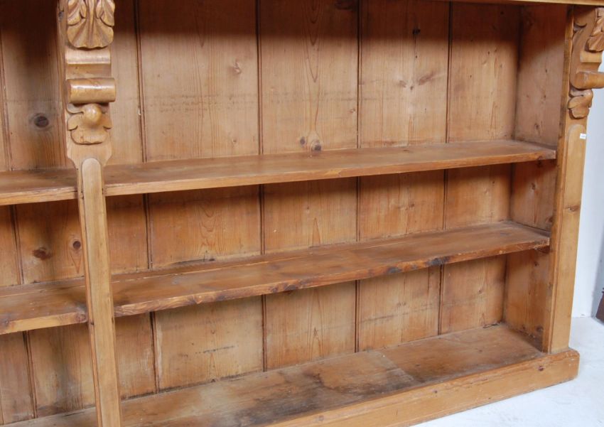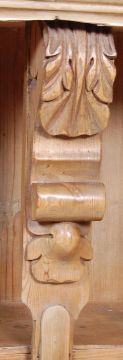 A large early 20th century pine double bookcase having a flared top with acanthus leaf corbels over three drawers raised on a plinth base. Measures. 100cm h x 141cm w x 36cm d