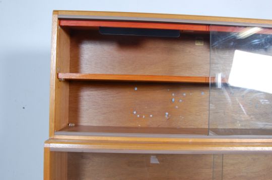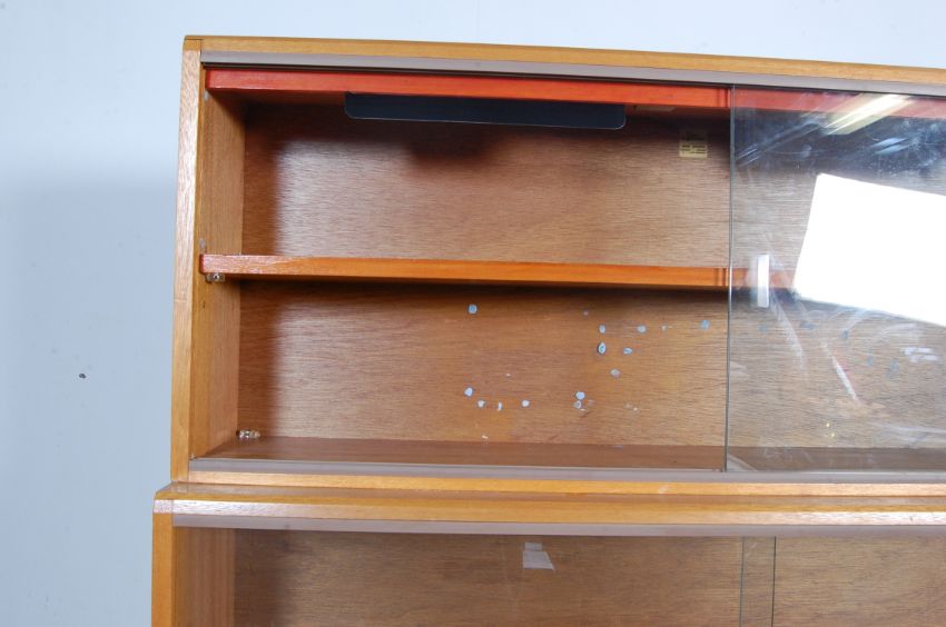 A retro vintage 1960s 20th century Simplex stacking bookcase having a three tiered glass fronted sliding door lawyers bookcase atop a sliding door cabinet opening to reveal a shelved interior. Measures 183cm h x 122cm w x 47cm d