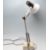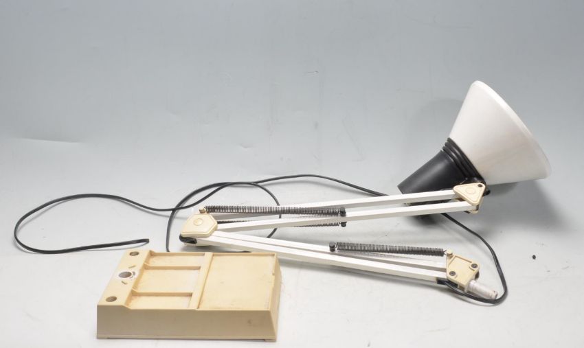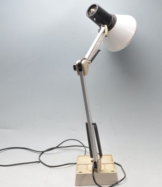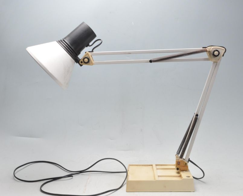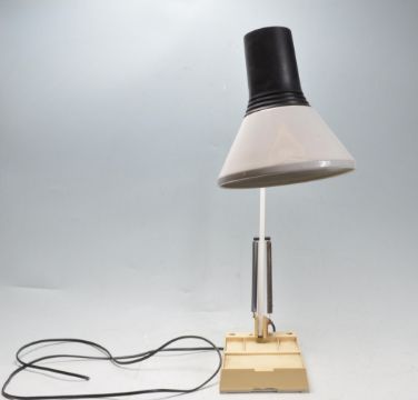 A retro vintage 20th century desk top anglepoise lamp having a two tone shade, two arm support raised on a square plastic base.