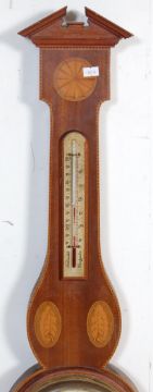 A 20th century antique style aneroid banjo barometer by Short & Mason having solid mahogany body, with inlaid motifs and ebony boxwood stringing, thermometer on brass plate.