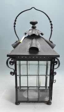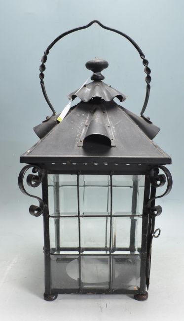 An early 20th century Art Nouveau style metal and glass hanging lantern / porch lantern. The lantern having an arched twisted handle atop, with pyramidal vented top above four bevelled glass panels with cross wired decoration to the front and flat band scrolled  decoration to the corners raised on bun feet. Measures: 50cm tall. Condition: Good condition overall no major damage just general wear and tear.