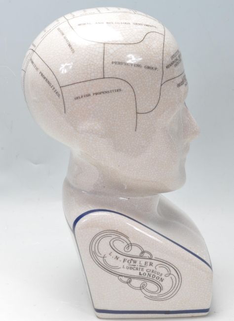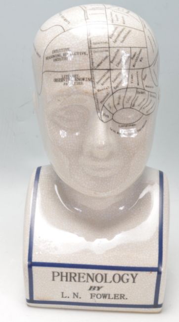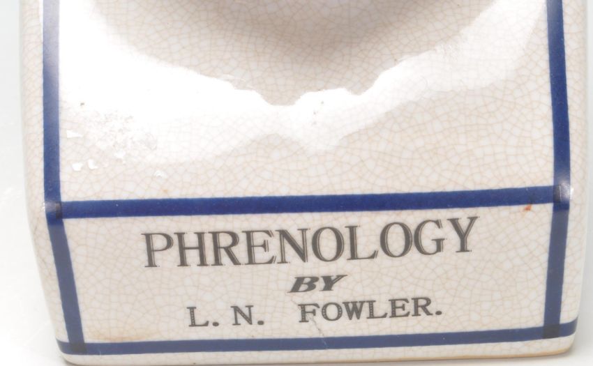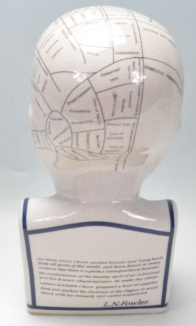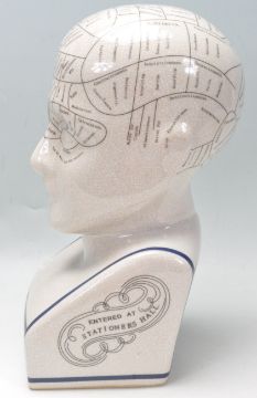 A vintage 20th century ceramic Phrenology Head / crackle glaze cream ceramic bust, marked ' Phrenology By L N Fowler. Notation throughout with script to verso. Great example. Measures 28cm-high.