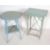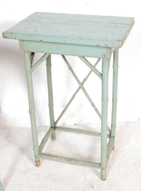 Two vintage mid 20th century bamboo stands having a square and a circular table top raised on bamboo supports united by stretchers. Painted in pale green and teale colourway. Measures 66cm h x 47cm diameter