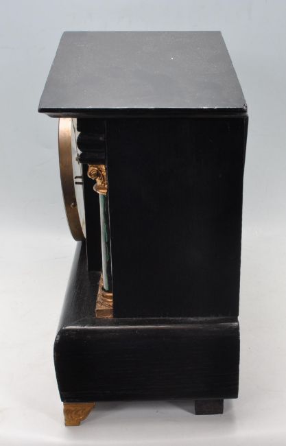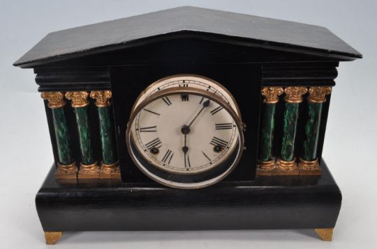 A vintage 20th century mantel clock of architectural form having a pediment top with six green Corinthian columns raised on a plinth base. The clock having a white face roman numerals to the chapter ring