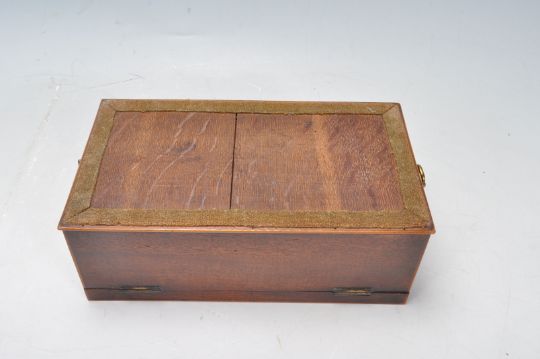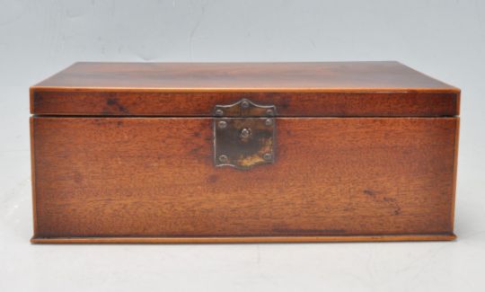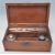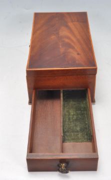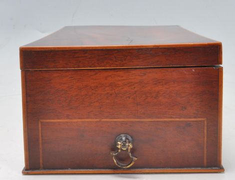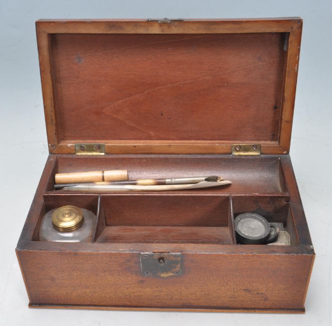 A 19th Century Victorian feathered mahogany and boxwood writing box having axehead finial handles to each side. The box has a hinged lid opening to reveal a fully appointed interior with writing instruments and ink well. The box also has a secret compartment to the side. 9cm x 23cm x 13cm
