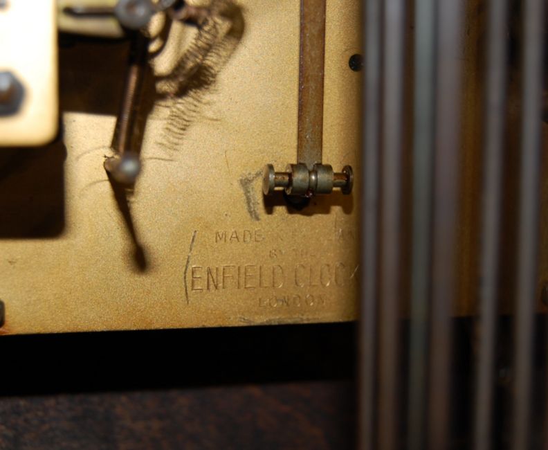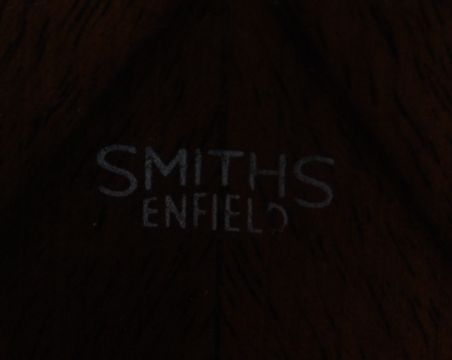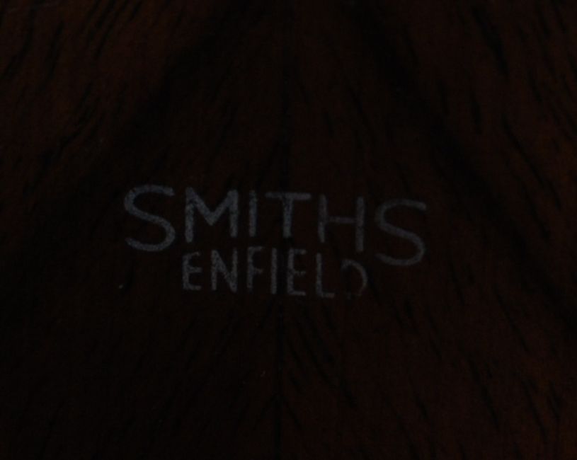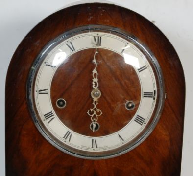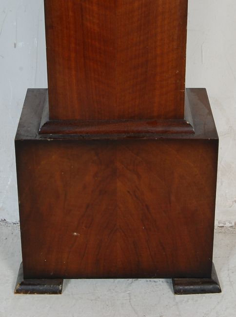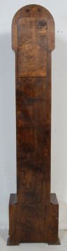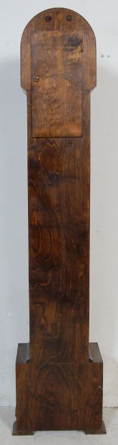 An early 20th century 1930s walnut veneer 8 day grandmother clock by Smiths of London. The clock having a silvered dial with roman numerals to the chapter ring is set with a walnut veneer Art Deco style case having a round clock hood raised on an angular body. Movement made by the Enfield clock company. Measures 144 x 30 x 20 cm.