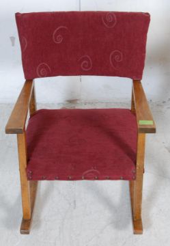 A vintage mid 20th century oak Air Ministry chair having a brown vinyl back rest and seat with shaped elbow rests raised on square supports united by stretchers. Air Ministry crows foot to the underside. Together with a child's vintage oak rocking chair. 86cm h x 55cm w x 54cm d