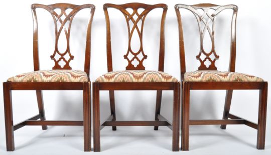 A set of six 20th Century Chippendale Revival mahogany dining chairs having a hand carved scrolled and decorative pierced vase splat knot back rest with inset Braganza upholstered seat pads. All raised on reeded square legs united by 'H' stretcher. Measures approx; 95cm x 48cm x 48cm.