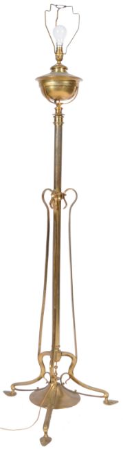 An antique 19th Century Victorian brass Art Nouveau standard lamp of heavy form having having a converted burner top with cylindrical column with Art Nouveau scrolled sides and feet. Measures approx 146cm x 50cm.