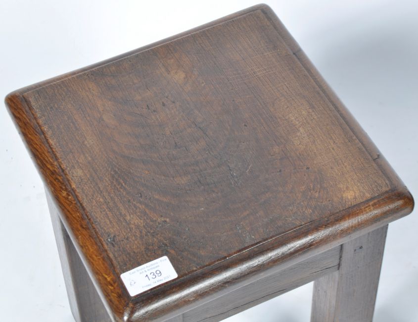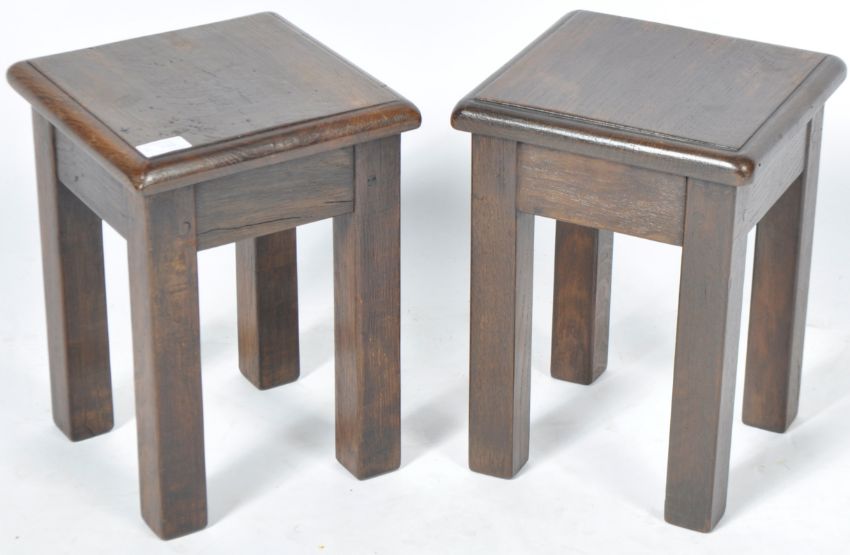 A pair of antique 20th Century English Country house rustic stools of solid oak construction. Each stool having a chamfered edge square seat top raised and supported by four chunky oak legs. Each measures approx; 36cm x 26cm x 26cm.