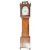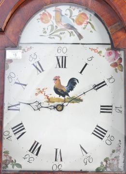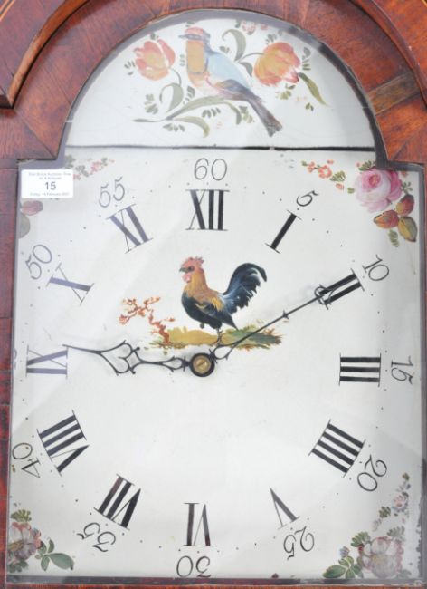 An antique early 19th Century Georgian oak and mahogany longcase clock grandfather clock. Brass set arched pediment top with turned brass finials. Glazed door to the hood flanked by reeded columns. Inset shell motif to the trunk door with further inlaid decoration. White enamel face with Roman numeral chapter ring decorated with pink floral sprays and cockerel. An impressive example. Measures: 228cm tall, dial 11 inches.