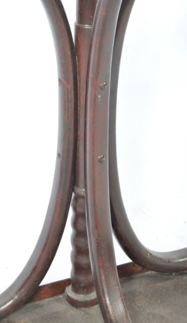 An original 19th Century Thonet (stamped) bentwood stick stand / umbrella stand of good proportions having a central turned finial column with shaped rail bar and three shaped bent supports. All raised on a metal pan drip tray with wooden feet. Stamped Thonet to underside. Measures approx; 75cm x 46cm x 24cm.