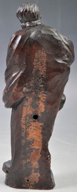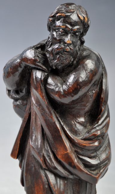 A 18th Century antique hand carved ecclesiastical religious limewood figurine depicting a Saint. Modelled with legs crossed standing on rocky naturalist base holding a cloth over shoulders. A great period example. Measures: 20cm tall.