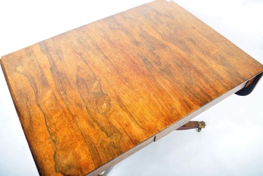 An antique early 19th Century Georgian Regency period English rosewood sofa table writing table desk having a good grain top with twin drop leaves raised on a tapering octagonal column over four leg quadruped rosewood base with bronze hairy paw feet with castors. A single long drawer hidden to the frieze on both sides. Measures approx 72cm x 106cm x 75cm.
