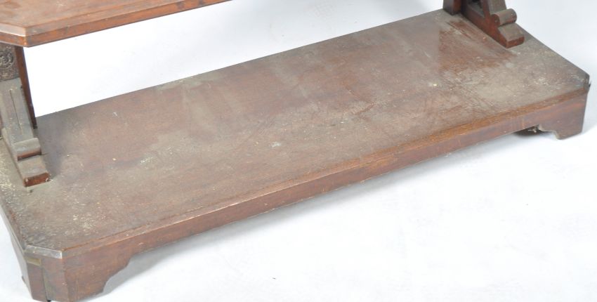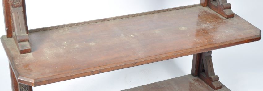 An antique 19th Century Victorian reformed gothic oak three tier dessert buffet sideboard stand having a carved gallery back, canted corner tiers supported by pierced gothic brackets all raised on bracket feet supports. Measures approx; 127cm x 130cm x 47cm.
