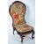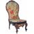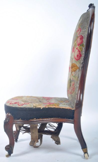 An antique 19th Century Victorian English rosewood and walnut nursing chair / bedroom chair of low spoon back form having a decorative arched backrest with carved floral decoration atop. Tapestry floral upholstery throughout raised on carved cabriole supports with ceramic castors. Measures approx 101cm x 55cm x 60cm.