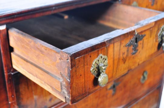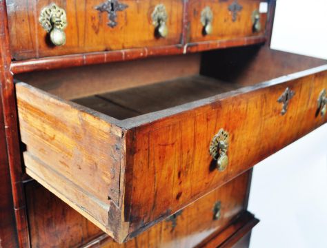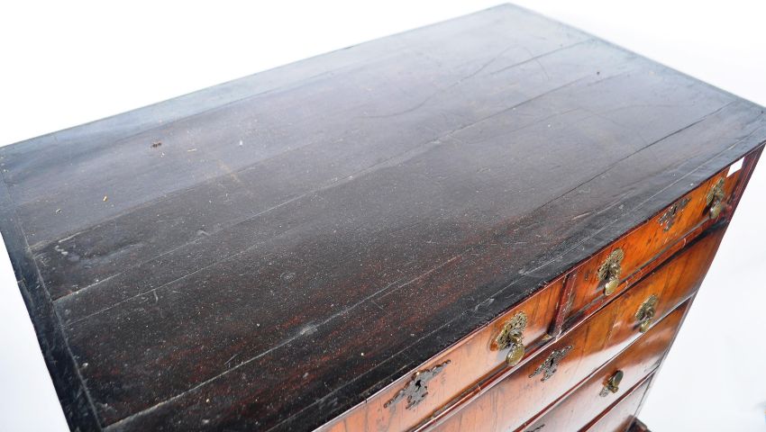 An antique 18th and later Century Georgian English walnut and oak chest on stand comprising a two over three chest of drawers with brass armorial locks, armorial drop swing pull handles. The drawers having front to back oak linings. Raised on a later 19th Century three drawer stand base on cabriole legs. Dismantles into two for ease of transport. A good honest example. Measures approx: 151cm x 98cm x 57cm.