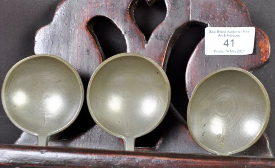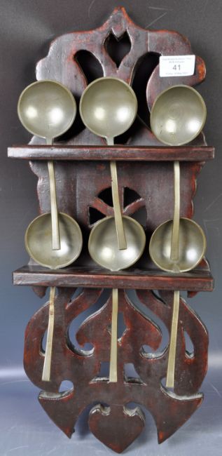 An antique early 19th Century Dutch carved pine / oak wall hanging spoon rack having. The ornate carved example with pierced detailing to the frame having a red lacquer finish. Complete with a set of six pewter spoons. Measures approx; 50cm x 21cm.