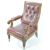 An antique 19th Century William IV English carved oak library armchair club chair having a brown leather button backed backrest with carved scrolling sides terminiting to the padded leather armrests with scroll ends. Overstuffed leather seat pad with brass stud detailing throughout with all raised on turned leg supports with further carved decoration and brass castors. Measures approx 105cm x 73cm x 77cm.