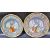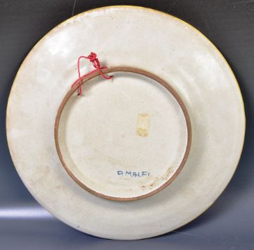 A pair mid 20th Century 1950's Italian hand painted cameo / portrait Majolica hanging plates with one depicting a man face right and the other a female facing left with both having scenic backdrops. Each having decorative patterned borders. Each measures approx; 26cm diameter.