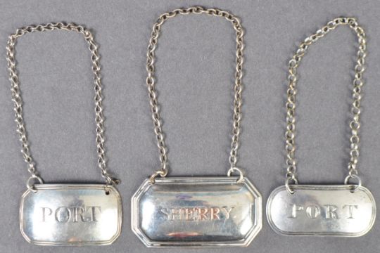 A collection of three antique 19th Century decanter labels comprising a Georgian hallmarked silver Port label by Elizabeth Morley London 1806, one by Joseph Willmore Birmingham 1814 and a silver plated example. Two with silver hallmarks and one unmarked.