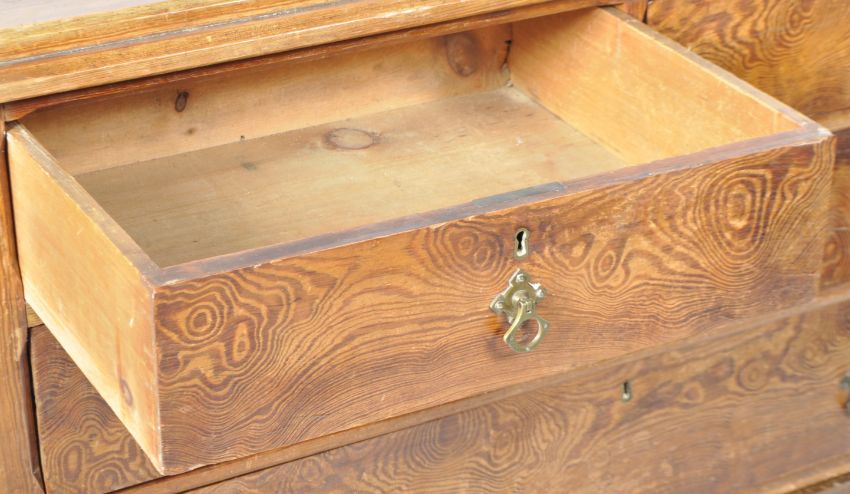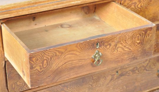 An antique 19th Century Victorian English Arts and Crafts pine chest of drawers of large form having a thick stepped chamfered edge top. Below a configuration of two short drawers over three long with each having brass drop swing handles. Raised on ceramic bun feet. Measures approx; 94cm x 128cm x 49cm.