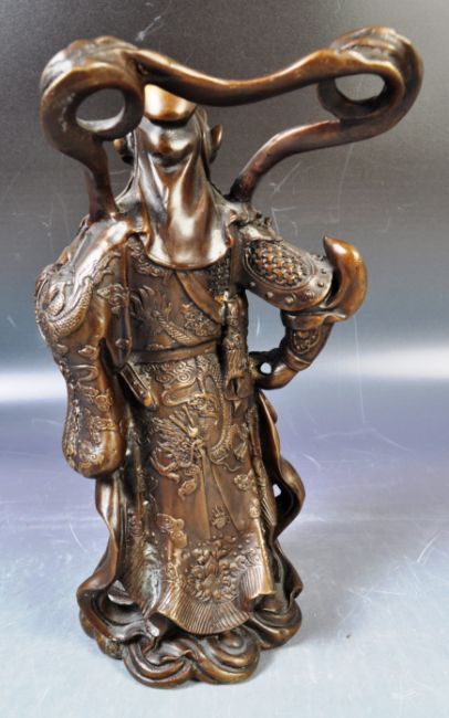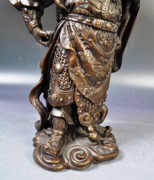 A 20th Century Chinese bronze figurine of the War God Guan Yin Jingzhou. The highly detailed figurine modelled in full battle armour set with dragons and scrolls raised on a scrolled cloud base. Measures approx; 25cm tall.