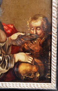 An antique 17th Century Italian oil on board Memento Mori Vanitas painting depicting a female figure likely the Penitent Magdalene with one hand resting on skull, the other holding a bowl that a child is drinking from. The figure faces towards the viewer in white gown with hair up and surrounded by a scarlet red cloth. Set to an ebonised frame. Frame measures; 35cm x 30cm.