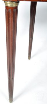 An antique early 19th Century French Empire mahogany and brass card table / games table of demi lune shape having brass borders to the table top raised on reeded tapering legs mounted with brass rings. Measures approx; 74cm x 115cm x 57cm.