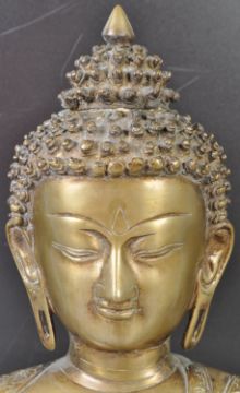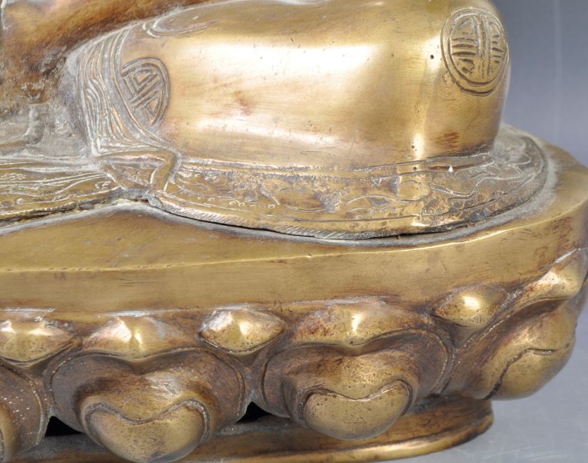 A very large and impressive heavy antique late 19th Century Chinese Oriental Tibetan bronze figurine of Buddha. The statue modelled with a beaded headdress with one open palm, legs crossed and the other hand resting on one knee. Seated on a lotus pedestal base with carved detailing to his robe and Shou symbols throughout. A good example. Measures approx; 52cm x 40cm x 25cm.