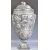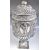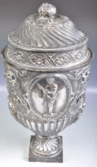 A large and impressive antique early 19th Century Georgian English grand tour silver plated Roman urn vase of classical form. The urn having an embossed cover with pomegranate finial atop and floral band below. Further embossed floral decoration interspersed with urns and oval cartouches with classical figures likey Apollo & Victoria with masks to both sides. Twisted stem with leaf decoration raised on a square plinth base. Marked to base. Measures 46cm x 26cm.