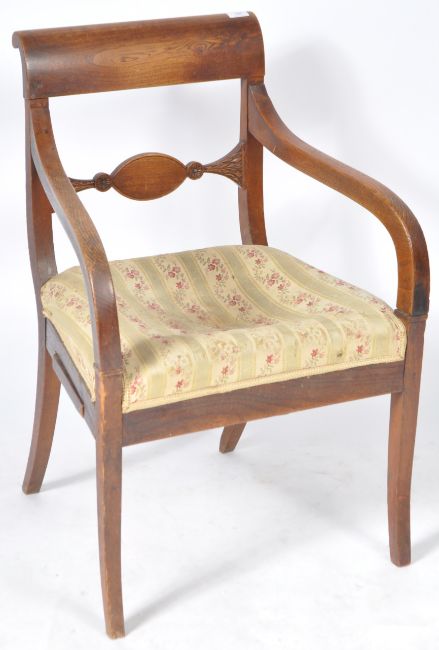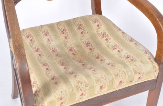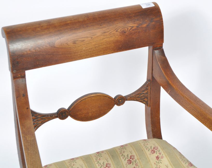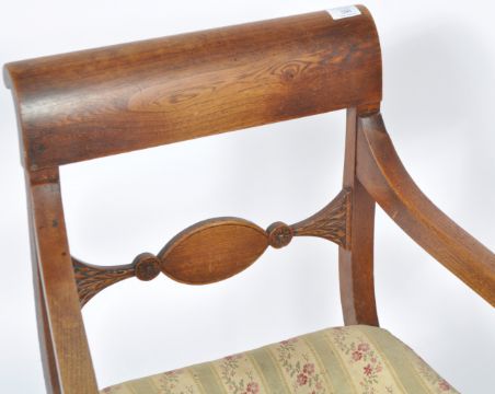 An antique 19th Century English Country / Farmhouse oak sheep shearers armchair having a scroll top and central carved rail to the backrest. The chair having open sweeping arms with a floral upholstered seat rest with a hidden drawer below opening via the side. All being raised on sweeping supports. Measures approx; 85cm x 55cm x 47cm.