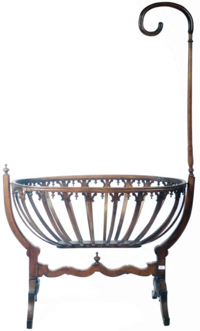 A charming antique 19th Century beech wood country house childs rocking crib / cot having a tall shepherd crook top on tapering column over the rocking basket form crip section with slatted open sides, carved detailing and inverted finials. Raised on a carved finial support base. Measures approx: 95cm x 116cm x 57cm (without top section.
