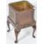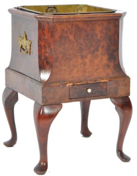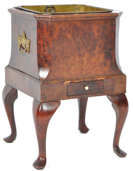 An antique 19th Century Queen Anne revival oyster veneer walnut wine bucket / champagne ice bucket stand having an inset tin liner with canted sides and armorial brass rams head handles and single drawer to the side. All raised on  cabriole legs. Measures approx; 45cm x 29cm x 29cm.