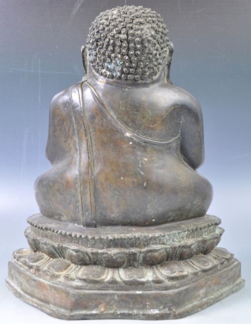 An impressive 19th Century Chinese Thai antique bronze figurine of Kātyāyana or Mahākātyāyana / Phra Sangkajai, (Sanskrit; Pali: Kaccāna, Mahākaccāna, or Mahākaccāyana) was a disciple of Gautama Buddha. The fat figure modelled with beaded headdress and stretcher ear lobes. Raised on a double lotus pedestal base. Measures: 33cm x 27cm.