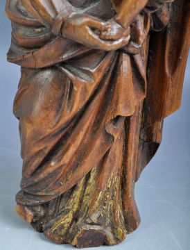 An antique 17th Century Continental religious ecclesiastical hand carved limewood figurine depicting The Madonna & Child Christ. The figure having detailed carvings with draped robes and features raised on a naturalistic base. A good period example. Measures approx; 32cm tall.